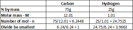 Determine the empirical formula of an organic compound that contains 75% carbon and 25% hydrogen by mass.