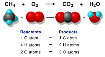 Goal: to make the number of atoms in the reactants and products equal to each other (because atoms can't disappear!)