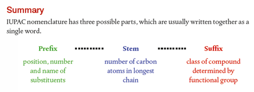 Suffix (the ending) adds to the name, which replaces the ‘-ane’ ending in the parent alkane